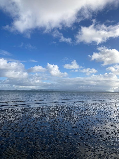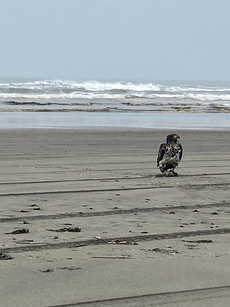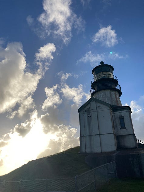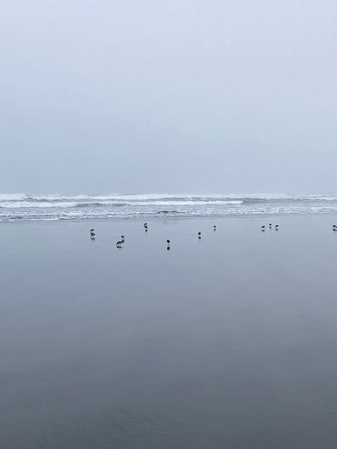 Every morning I woke, stretched, and made tea. I walked, sometimes to the beach sometimes around town. It rained A LOT. I loved it. I enjoyed the sauna and napped and walked to the coffee kiosk to refuel my cup. I saw the moon once. I ate clams and mussels and rockfish. I wrote and wrote and walked and edited. At night, I made collage in a tiny sketchbook. On my last day, the sun broke out and I drove along the peninsula and arrived at a nature reserve. I walked alone along a wide sunny beach, facing the mainland of Washington State I watched birds lift and flutter down in groups. The sun made diamonds in the sand. I hiked to a lighthouse before finally leaving the peninsula, destined to drive home in the dark.