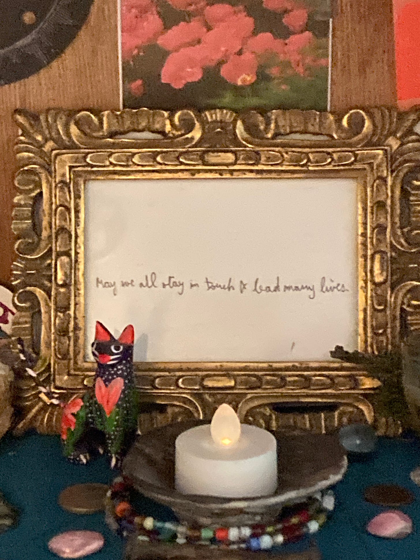 When Travis died, I printed postcards with his handwriting, from a letter he sent me: May we stay in touch and live many lives. I shared them with strangers and his friends. It is a good wish, to keep the connection with the people you love as you move through the world, destroying and rebuilding, being broken apart and rebuilding. Living many lives. Not skating by unnoticed, not flattening your heart under covers. Living.